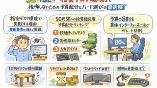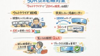 50代SEの老眼対策に最適なウルトラワイドモニター活用法を解説。フォーカス遅延による疲労や集中力低下を改善し、作業効率を高める環境構築のポイントを、WQHD・湾曲モニターの選び方とともに紹介します。