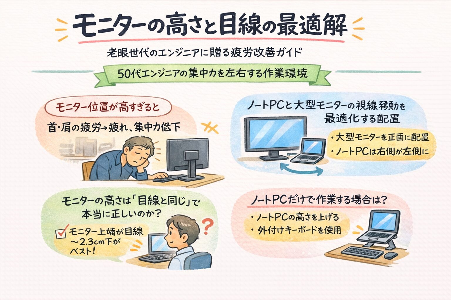50代を過ぎたエンジニアにとって、モニターの高さと目線の最適化は、もはや「好み」の領域ではなく、「持続可能なキャリアを支えるためのインフラ整備」です。
